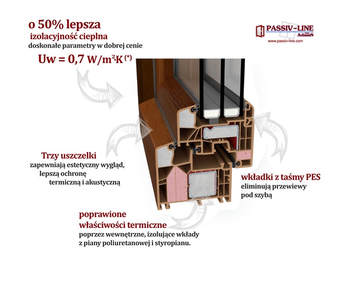 Окна Passiv Line Plus характеризуется высокими теплоизолирующими свойствами. Коэффициент теплопроводности стеклопакета с аргоном составляет Uw = 0,5 Вт / м2К, при чем коэффициент теплопроводности окна достигает теплопередачи Uw = 0,7 Вт / м2К. Инновационность этого продукта заключается в применении пенополиуретана и пенополистирола в заполнении профильных камер. Это самое идеальное решение для энергоэффективных и пассивных домов. Преимущества окон Пассив Лайн Плюс: Энергоэффективность - это значительное сокращение расходов на отопление. Лучшая теплоизоляция и звукоизоляция, что обеспечивается двухкамерным стеклопакетом в 48 мм и тройным контуром резиновых прокладок по периметру.